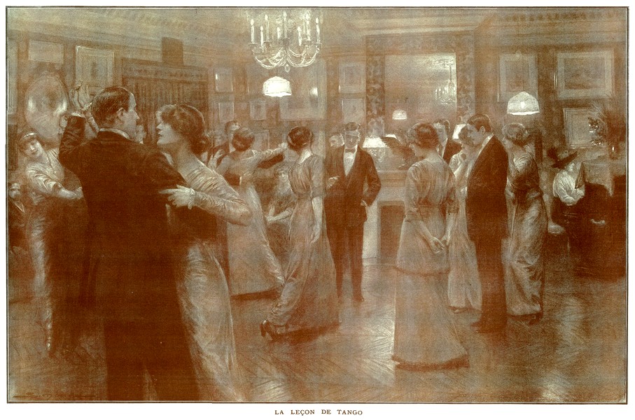 Le tango est partout. On l'apprend en cent lieux divers : dans des salons tendus d'étoffes persanes et fleurant des parfums d'aromates, sur la piste cirée et brillante comme le ring d'un skating des Dancing-Palaces, sur les planches des music-halls et l'estrade des cafés-concerts, dans les cours de danse les plus réputés et dans de misérables logements à peine meublés, où exercent à bon marché d'obscurs professeurs qui, souvent, la veille encore, faisaient un métier tout autre ; dans les quartiers aristocratiques et mondains du faubourg Saint-Honoré et de l'Etoile et jusque dans les lointains parages de la rue de Clignancourt. Ici la leçon se paye cent francs, là cinquante, ailleurs cinq, trois, deux et moins encore ; en certains endroits, on a une tasse de thé par-dessus le marché.