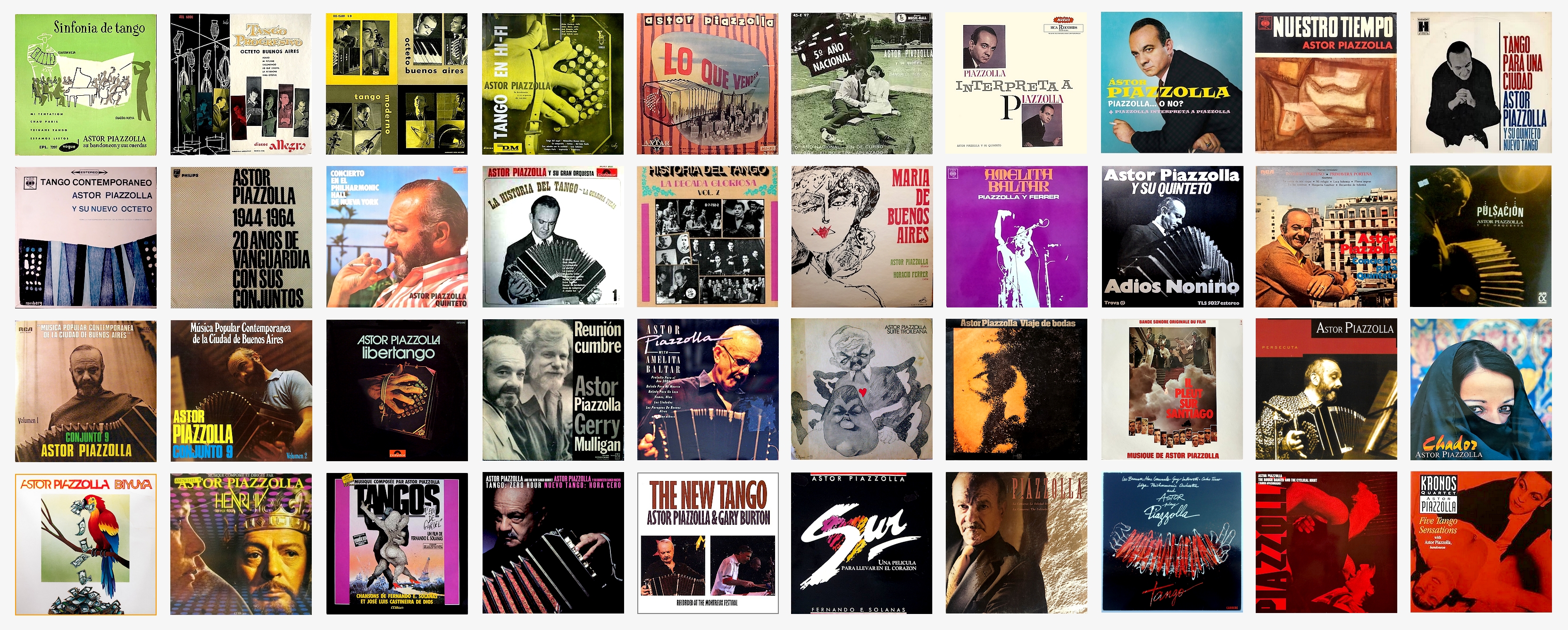 El crack, Jose A. Martinez Suarez, Argentine, 1959 / Argentinisima, F. Ayala et H. Olivera, Argentine, 1972 / El canto cuenta su historia, F. Ayala et H. Olivera, Argentine, 1976 / Cadaveri Eccelenti, Francesco Rosi, Italie, 1976 / El exilio de Gardel, Fernando "Pino" Solanas, Argentine-France, 1984 / Raw Deal, John Irvin, États-Unis, 1986 (contenant la célèbre version de "Libertango" par Grace Jones et "I've seen that face befote") / Frantic, Roman Polanski, France-États-Unis, 1988 (toujours avec la version de Grace Jones) / El Sur, F. "Pino" Solanas, Argentine, 1988 / El viaje, F. "Pino" Solanas, Argentine, 1992 / All Ladies Do It, Tinto Brass, Italie, 1992 / Citizen Langlois, Edgardo Cozarinsky, France, 1994 (avec la musique du Kronos Quartet et de Piazzolla / Unter der Milchstrasse (Sous la Voie Lactée), M. X. Oberg, Allemagne, 1995 / 12 Monkeys, Terry Gilliam, États-Unis, 1995 / Blue in the Face, Wayne Wang et Paul Auster, États-Unis, 1995 / Happy Together, Wong Kar-Wai, Hong Kong, 1997 / et The Tango Lesson, Sally Potter, Grande-Bretagne, 1997. Et parmi un grand nombre de documentaires tournés, citons Quereme así (Piantao), Elisea Alvarez, 1997, et El Tango es una Historia, Humberto Rios, Mexico, 1994.
