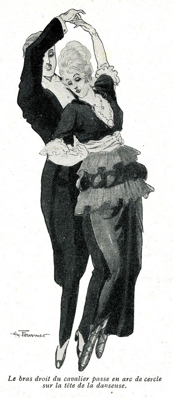DIXIEME FIGURE Placés l’un derrière l’autre, main droite dans main droite, main gauche dans main gauche, le cavalier et la cavalière doublent alternativement du pied droit et du pied gauche, mais avec cette particularité que, sur le deuxième temps ils fléchissent le genou droit en tournant légèrement. Tous ces pas se font un peu ad libitum ; on peut, et c’est sans importance, intervertir l’ordre des figures. Et voilà la danse qui certainement, va disputer au tango la faveur des gens du monde.