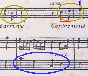 mesures ; enfin, cerclé en bleu, la cassure rythmique par quatre croches sur le 2/4 et quatre