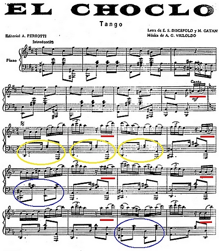 On en profitera pour remarquer que bien souvent, et contrairement à une idée reçue, le tango n'a pas abandonné le rythme de la habanera, croche pointée, double-croche, croche, croche, et qui serait réservé à la milonga. Dans la réalité, dans de nombreux tangos de la première période, la différenciation se faisait ainsi : dans la milonga ce rythme était primordialement présent à la fois, dans l'accompagnement et dans la mélodie ; le tango s'en est affranchi dans la mélodie, mais l'a conservé dans la basse. Tango et milonga, pendant une longue période, se sont écrits de la même façon en ce qui concerne l'accompagnement rythmique. Les différences : l'affranchissement de l'ostinato rythmique dans la mélodie du tango, et sa "Bostonisation" qui a atteint toutes les danses a cette époque, le tango s'exécutant de manière généralement nettement moins rapide que la milonga.